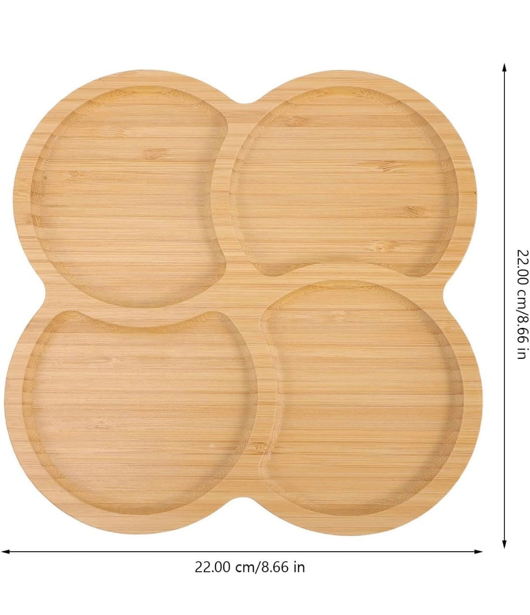 Dört ayrı bölmeli yuvarlak form: Tek tabakta dört farklı atıştırmalığı (çerez, kuruyemiş, meyve, sos vb.) ayrı bölümlerde sunma imkânı verir — pratik ve şık.