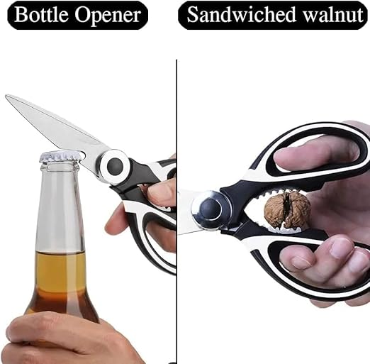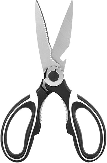 - Mutfak makası, çeşitli mutfak görevleri için kaymaz kesim sağlayan mikro tırtıklı bıçak kenarlarına sahiptir. Sert sızdırmaz şişeleri açmak ve hatta fındıkları kırmak için kolay kavranan saptaki tırtıklı bölüm! Ayrıca, şişelerin ve kavanozların hızlı ve kolay açılması için tasarlandı.